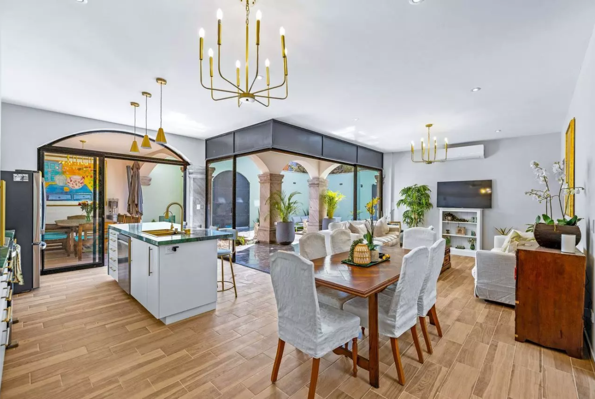 The open-concept living and dining areas connect seamlessly to a modern kitchen, featuring the most up-to-date appliances and high-end finishes, designed for both everyday living and entertaining. Large glass doors open toward a peaceful interior courtyard, with the most impressive water features allowing for an indoor-outdoor lifestyle that San Miguel is famous for, perfect for morning coffee, evening dinners, or simply enjoying the fresh air in privacy.