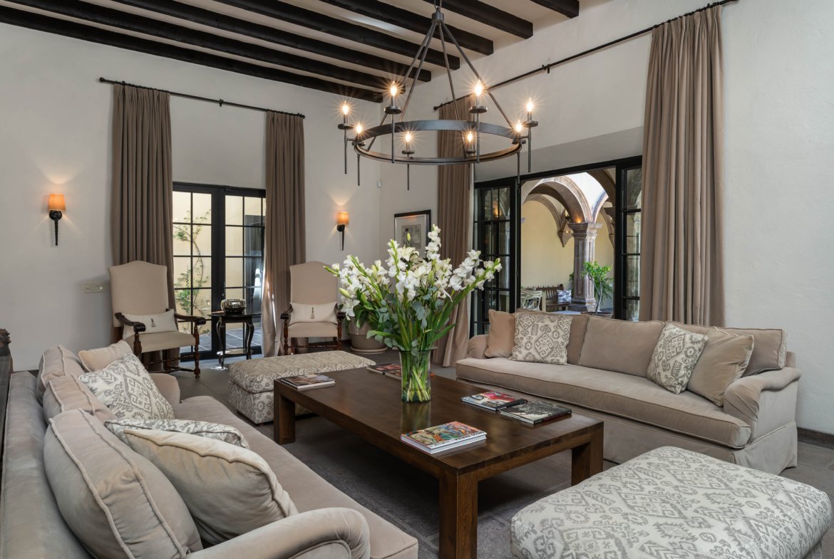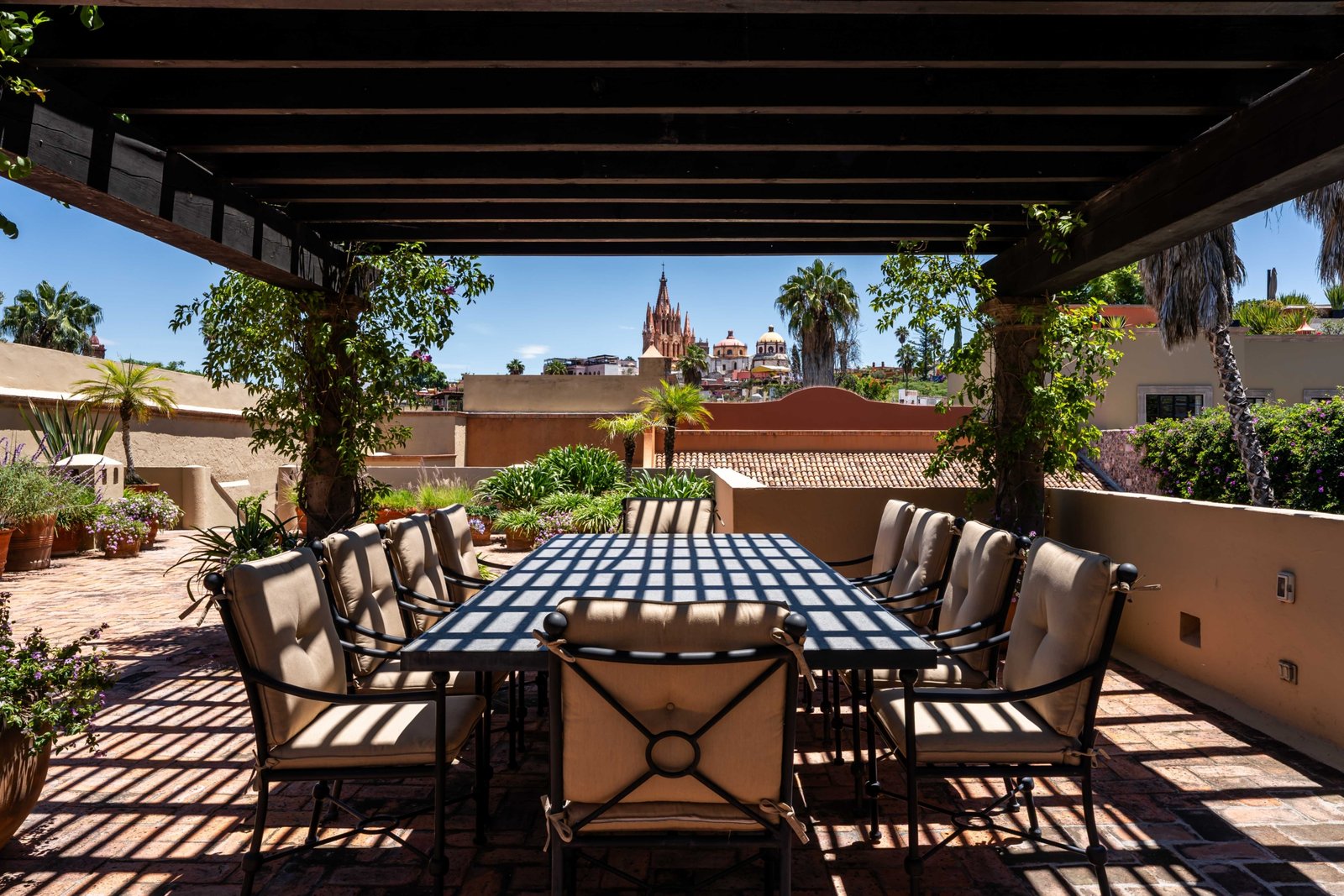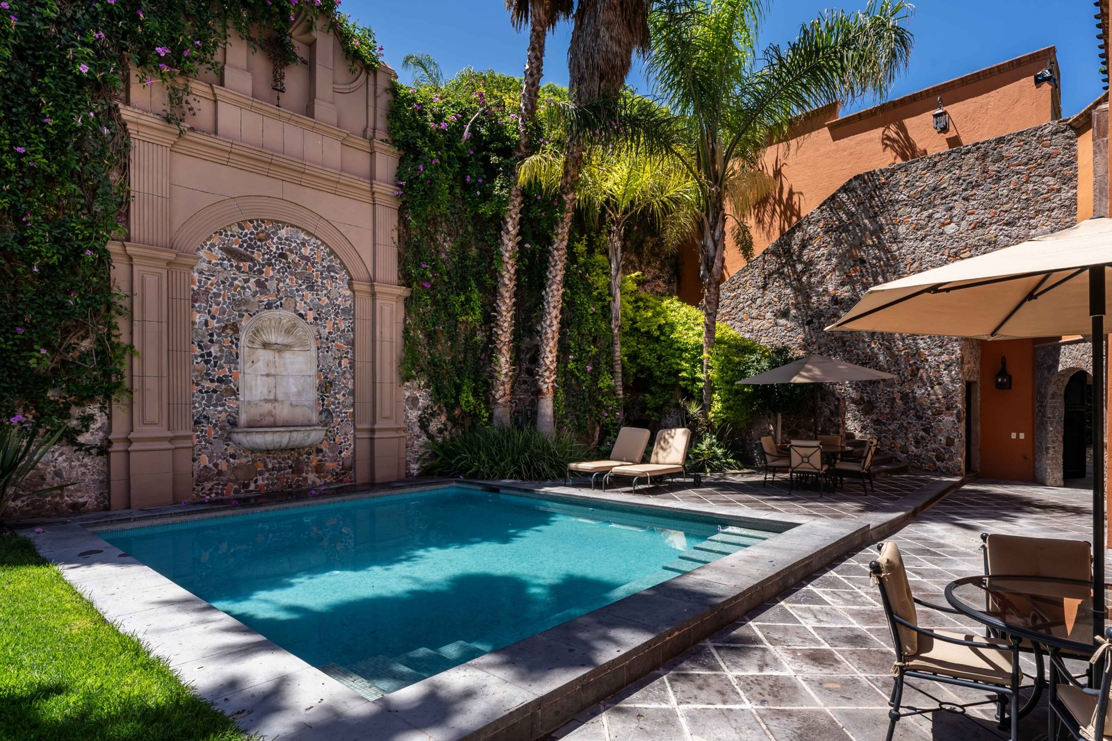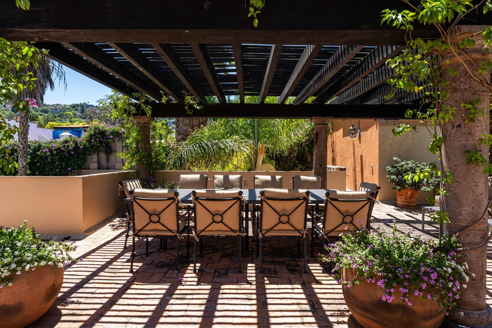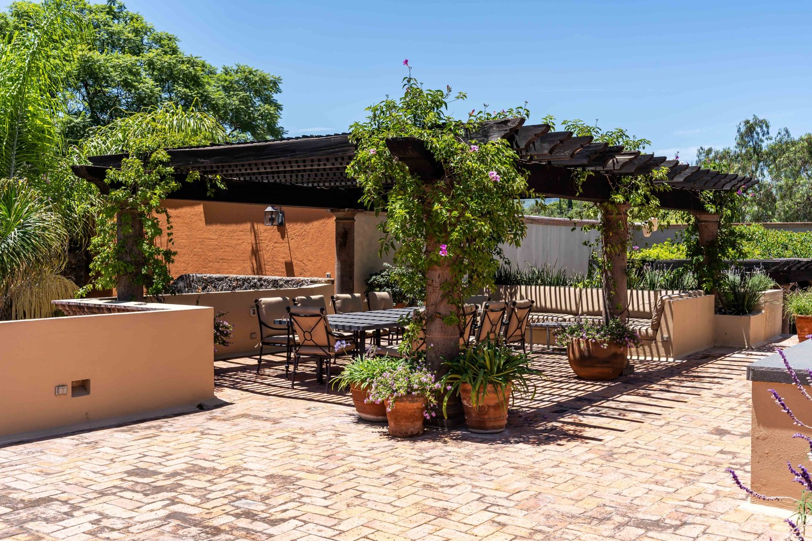 handkerchief ceilings into this breathtaking estate . Enjoy the expansive patio, large pool and lush lawn. With 6 spacious bedrooms with ensuite bathrooms, a hammam, 2 outdoor covered salas, a roof terrace with views of La Parroquia; every corner of this home is designed for relaxation and entertaining. Your dream retreat awaits!