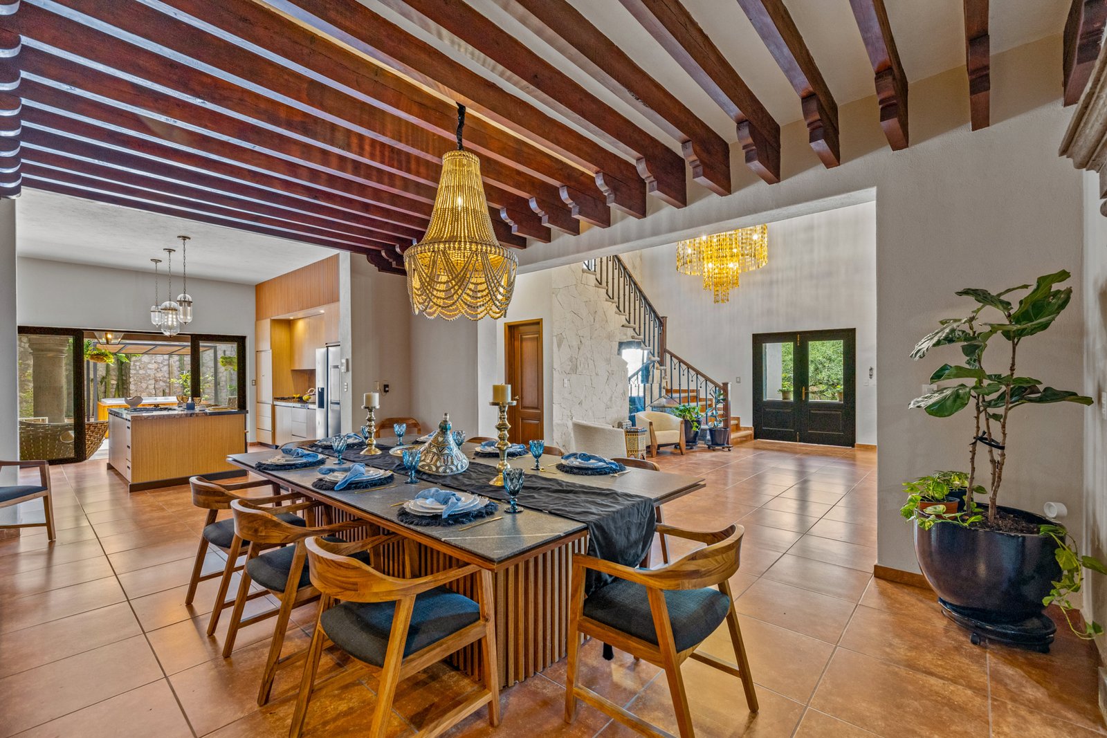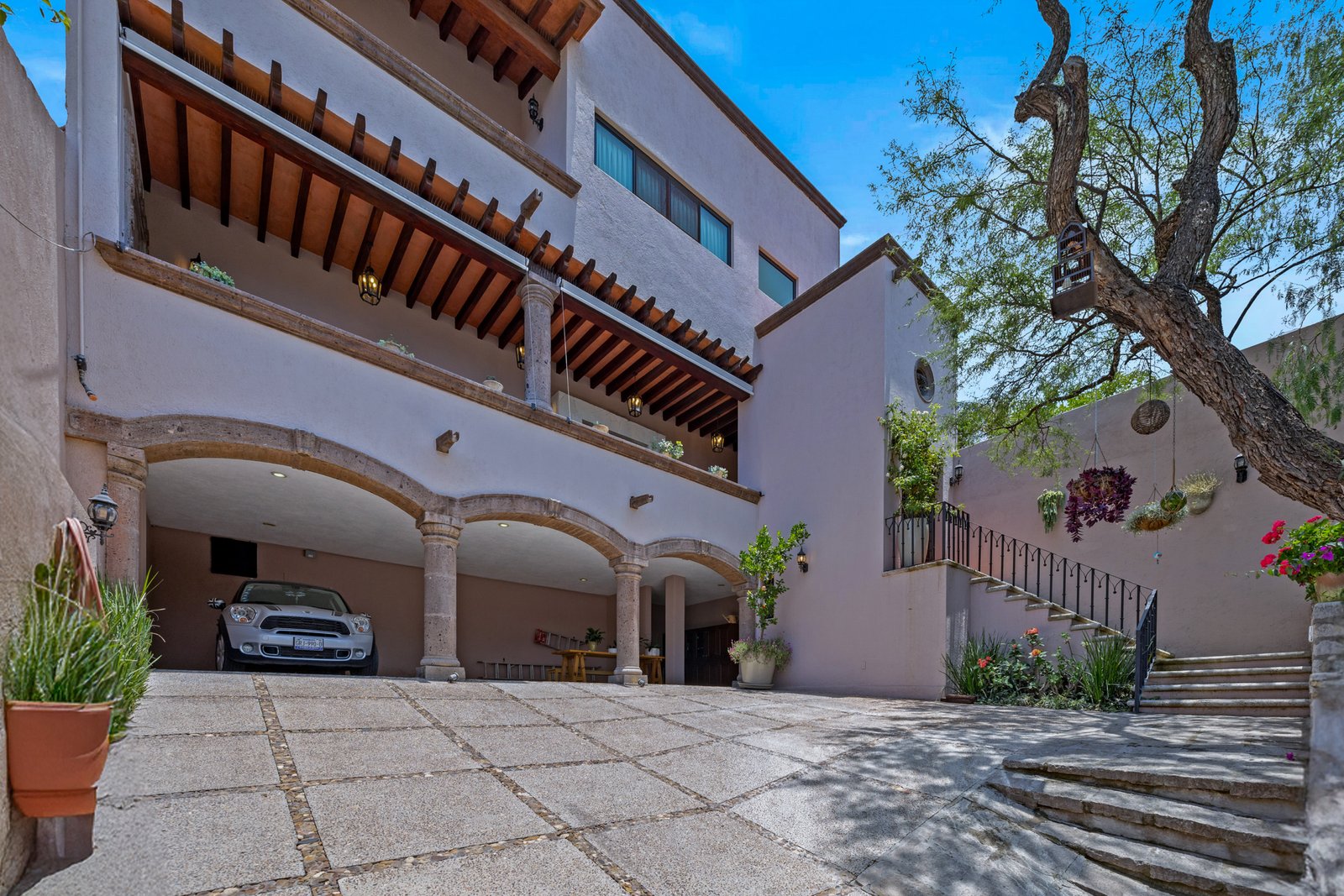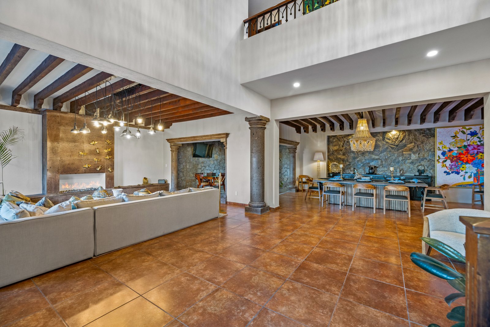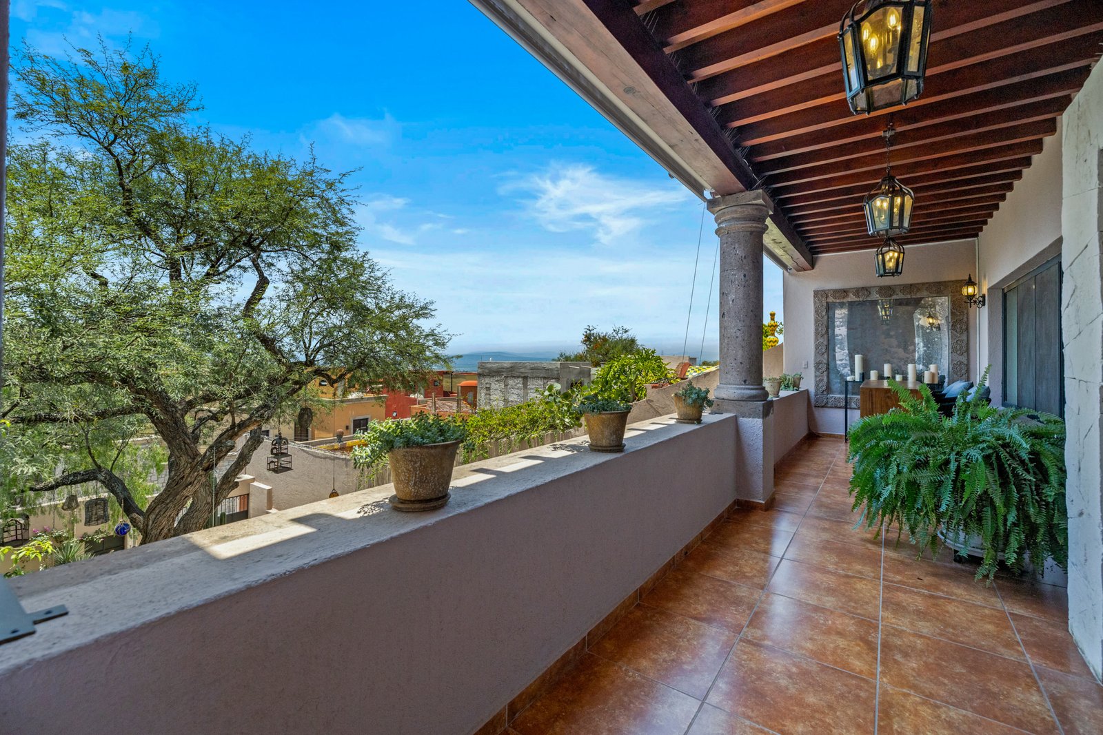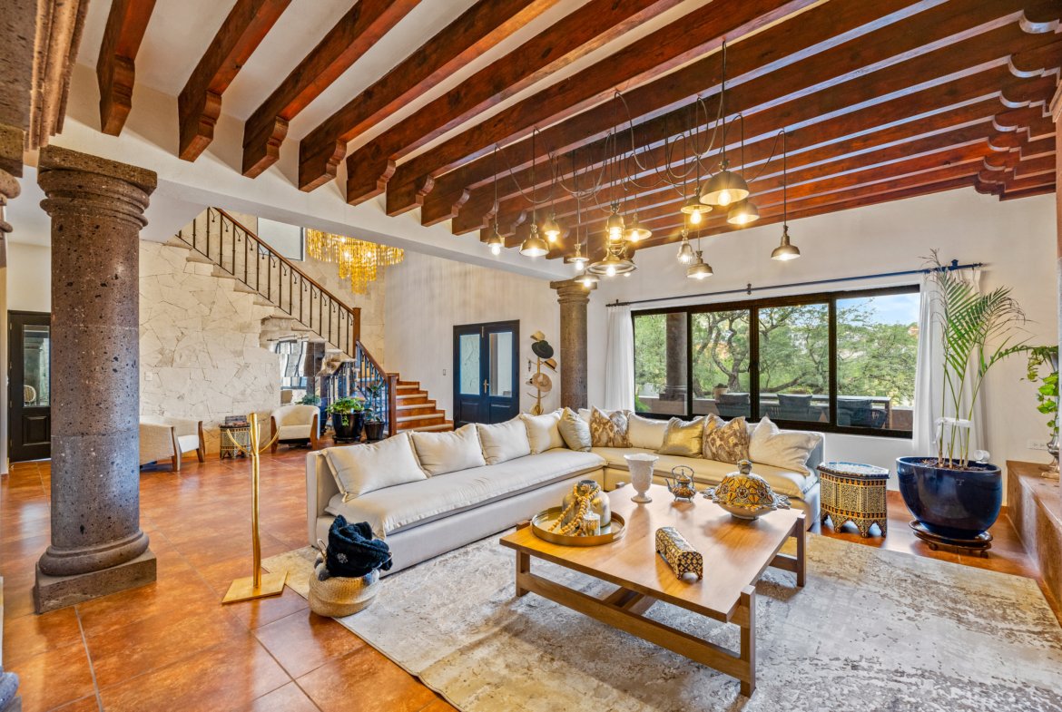 As you approach, you’re welcomed by a beautifully landscaped front garden and a striking mezquite tree that gives the home its name. The private driveway leads to a spacious garage with room for up to six vehicles a rare luxury in San Miguel. Step inside to a breathtaking open concept living space on the ground floor, where double height ceilings, a dramatic bóveda ceiling and a statement chandelier create a sense of grandeur. The inviting living room features a cozy gas fireplace, perfect for cool evenings. Entertain in style in the elegant dining room that seats twelve or enjoy cocktails at the fully equipped wet bar.