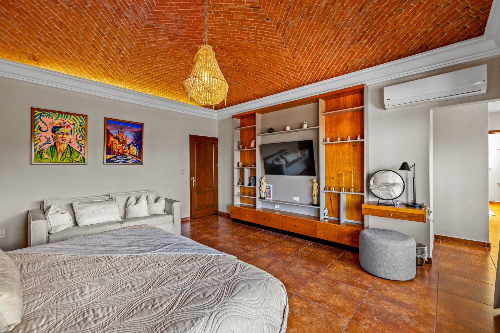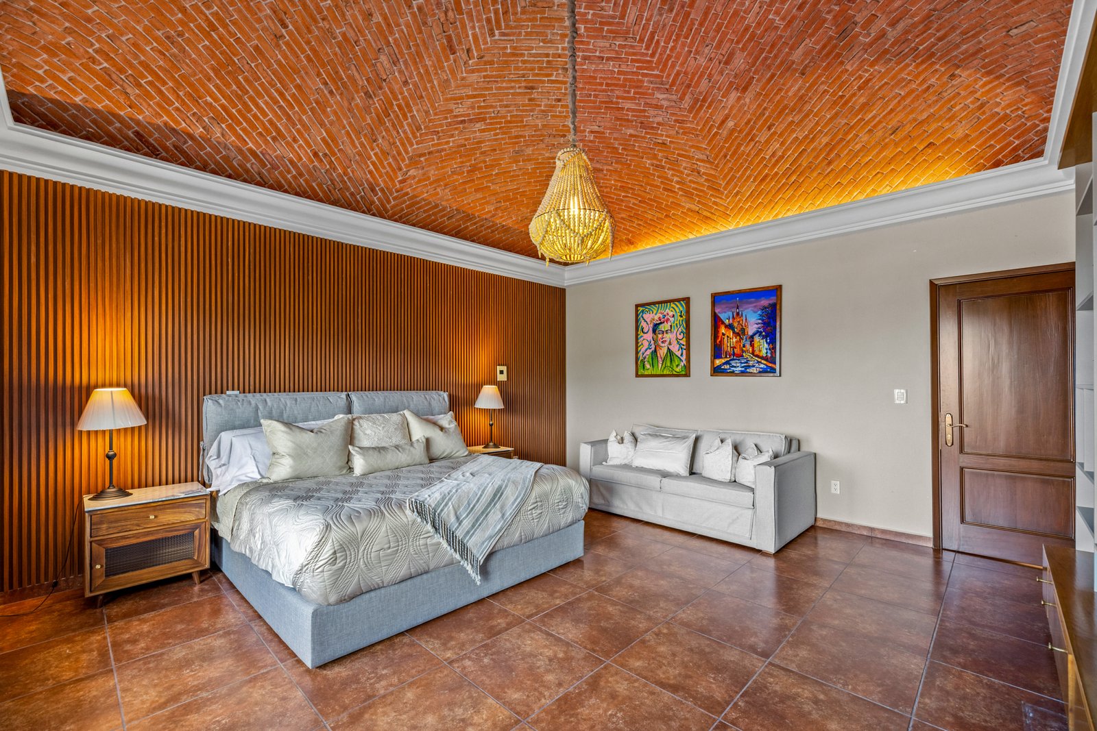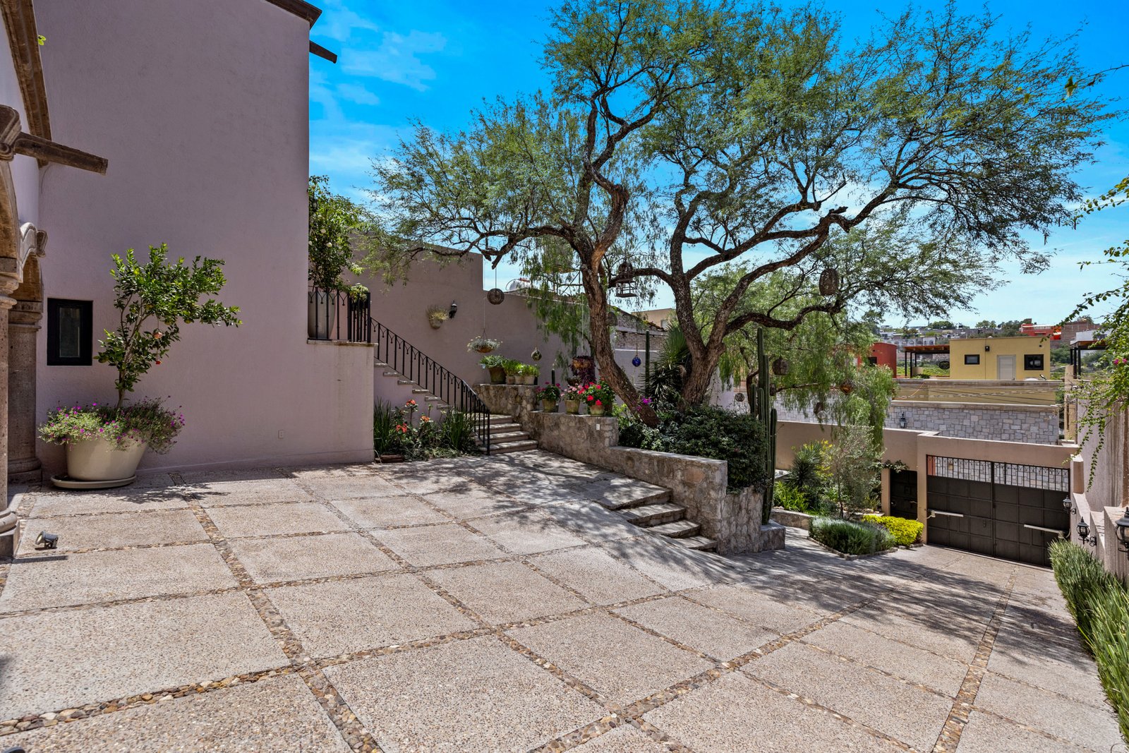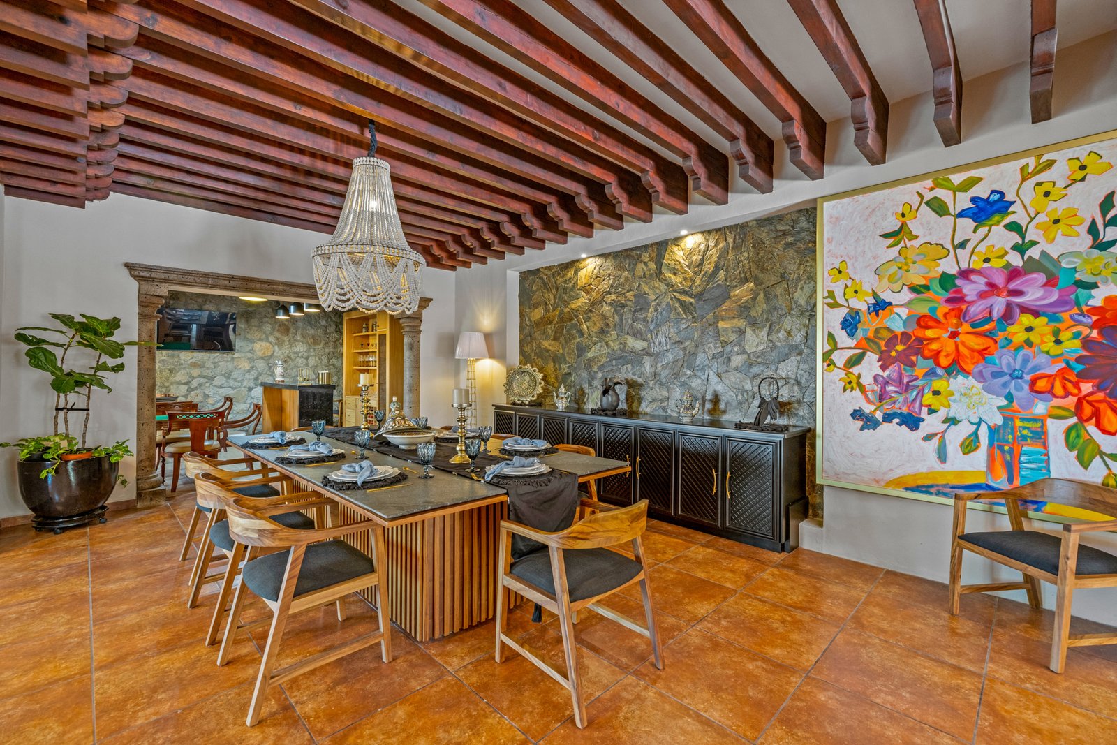 As you approach, you’re welcomed by a beautifully landscaped front garden and a striking mezquite tree that gives the home its name. The private driveway leads to a spacious garage with room for up to six vehicles a rare luxury in San Miguel. Step inside to a breathtaking open concept living space on the ground floor, where double height ceilings, a dramatic bóveda ceiling and a statement chandelier create a sense of grandeur. The inviting living room features a cozy gas fireplace, perfect for cool evenings. Entertain in style in the elegant dining room that seats twelve or enjoy cocktails at the fully equipped wet bar.