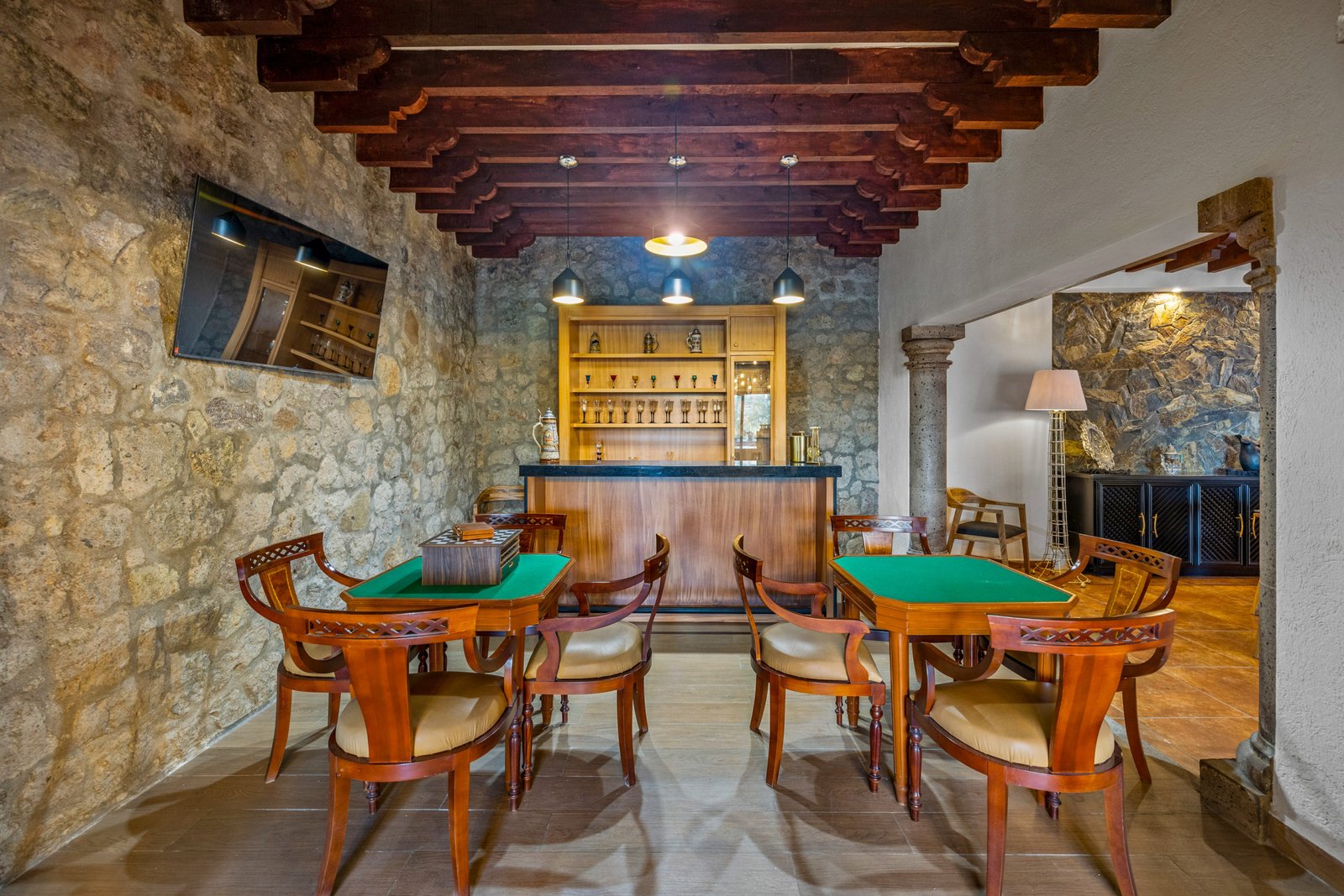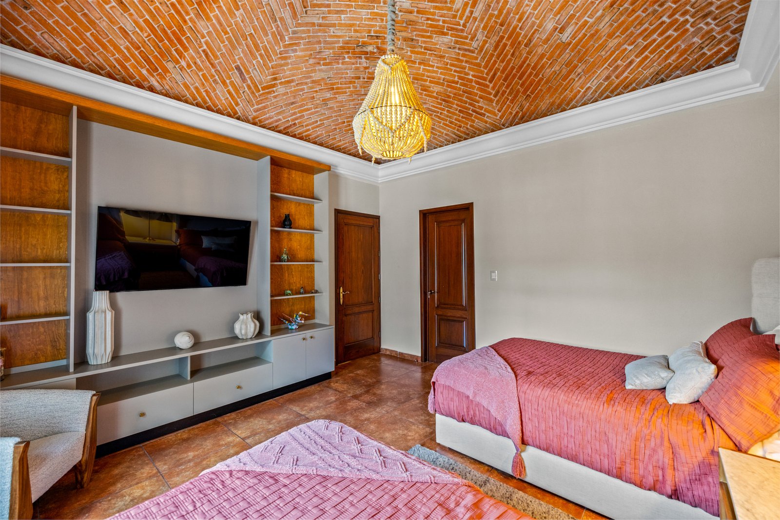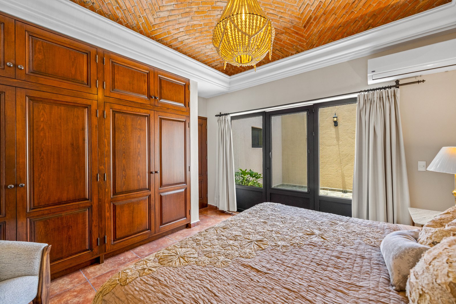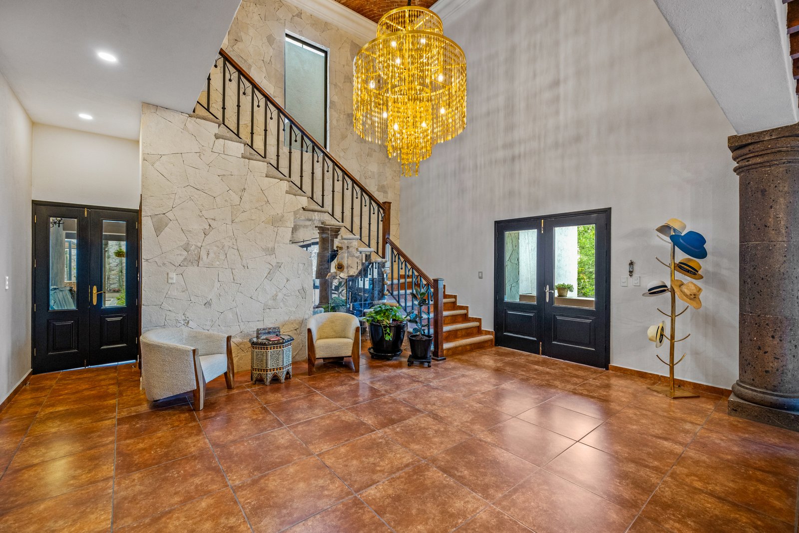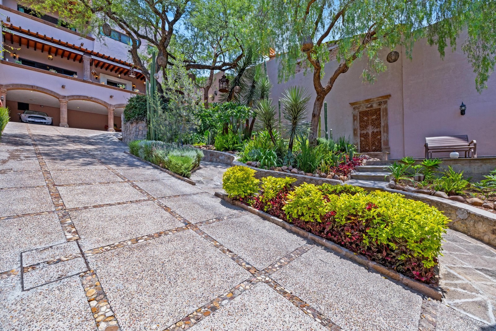 As you approach, you’re welcomed by a beautifully landscaped front garden and a striking mezquite tree that gives the home its name. The private driveway leads to a spacious garage with room for up to six vehicles a rare luxury in San Miguel. Step inside to a breathtaking open concept living space on the ground floor, where double height ceilings, a dramatic bóveda ceiling and a statement chandelier create a sense of grandeur. The inviting living room features a cozy gas fireplace, perfect for cool evenings. Entertain in style in the elegant dining room that seats twelve or enjoy cocktails at the fully equipped wet bar.