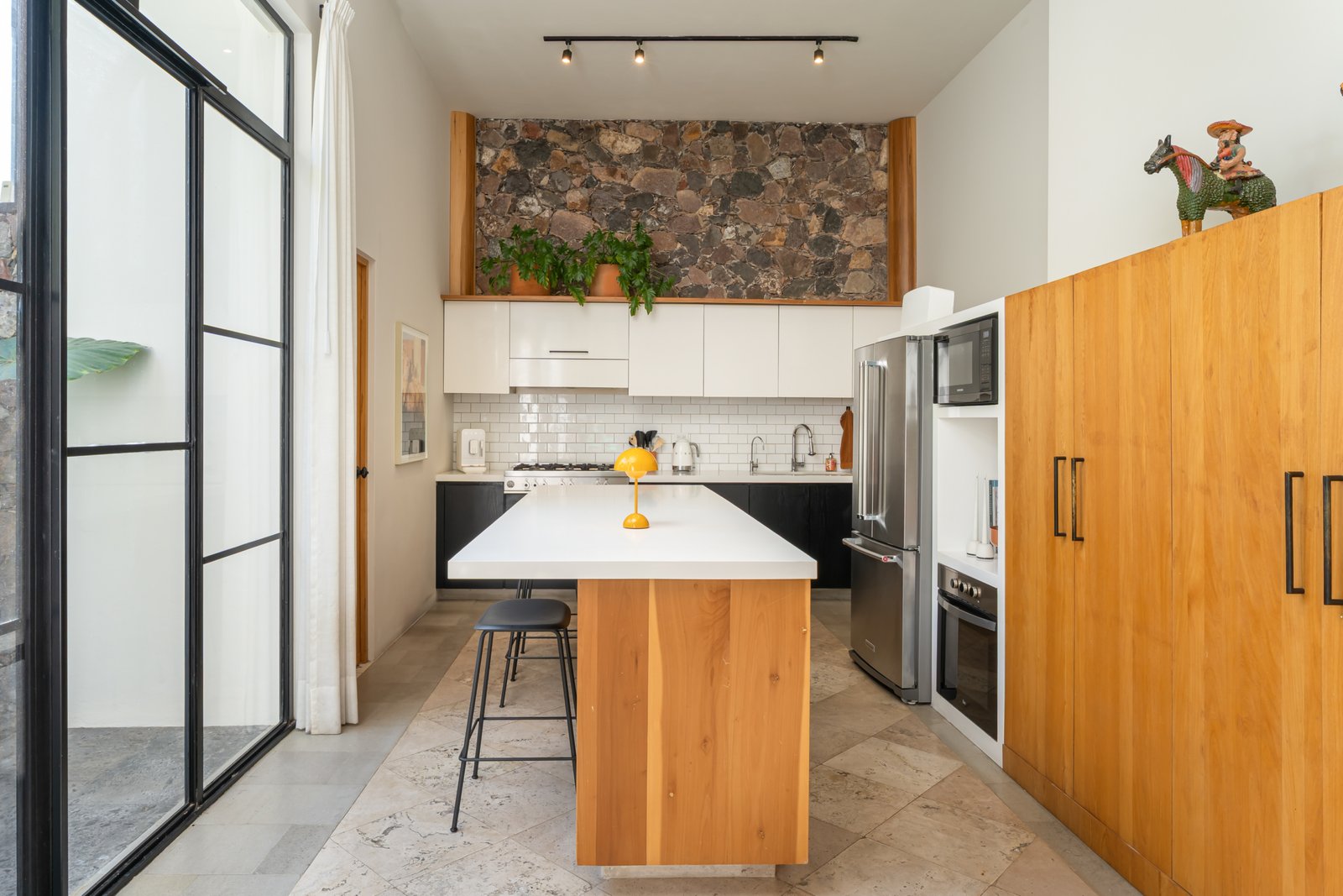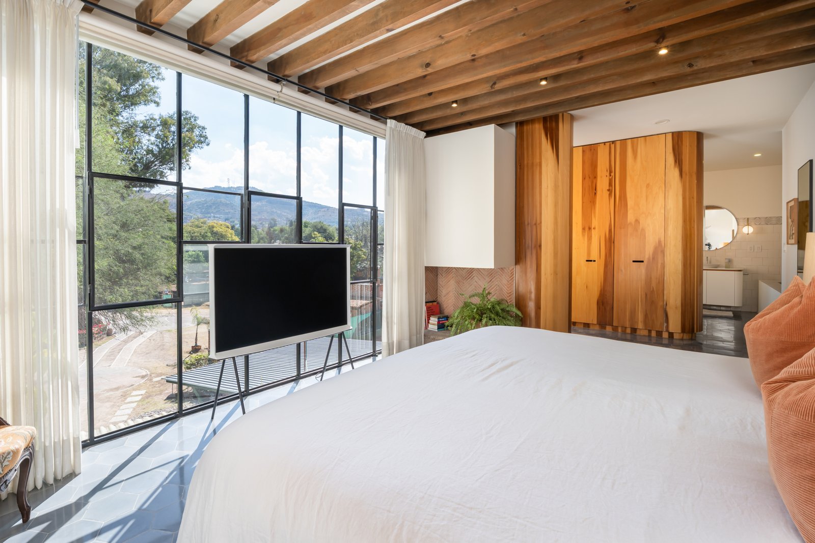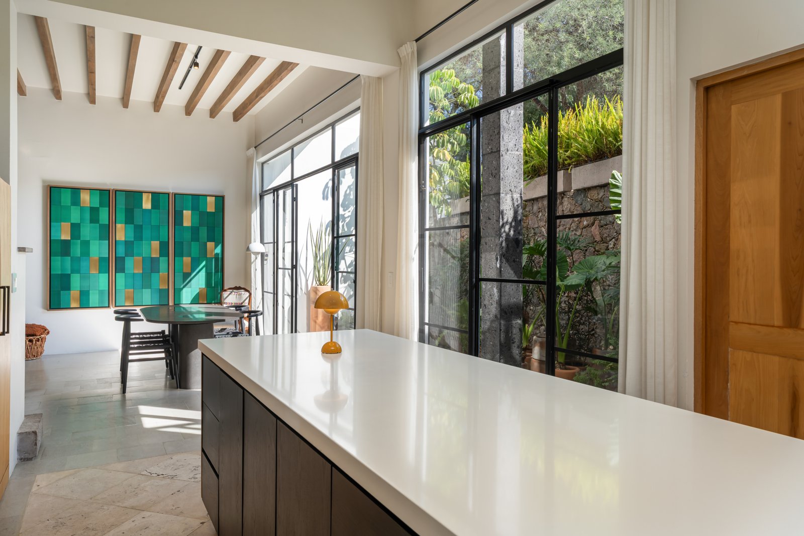 Designed for contemporary living, the home features an open concept living and kitchen area flooded with natural light, creating a seamless flow ideal for everyday comfort and effortless entertaining. Expansive windows allow abundant sunlight to allow abundant sunlight in and frame two panoramic views; the historic San Antonio Church on one side and the surrounding mountain landscape on the other. The result is a refined and authentic expression of modern Mexican living.