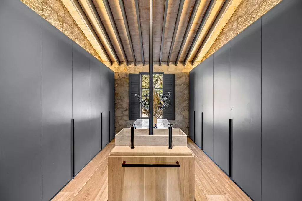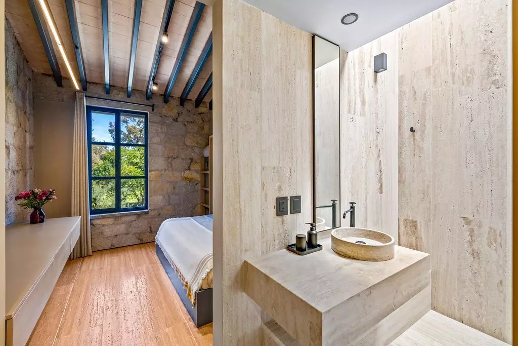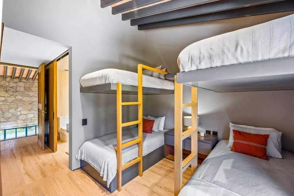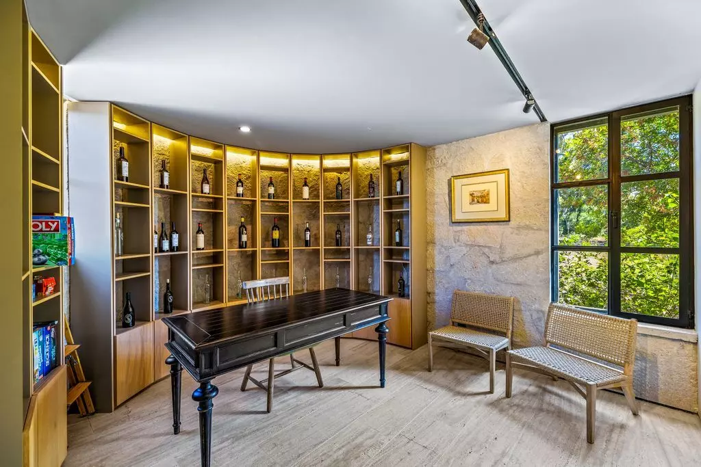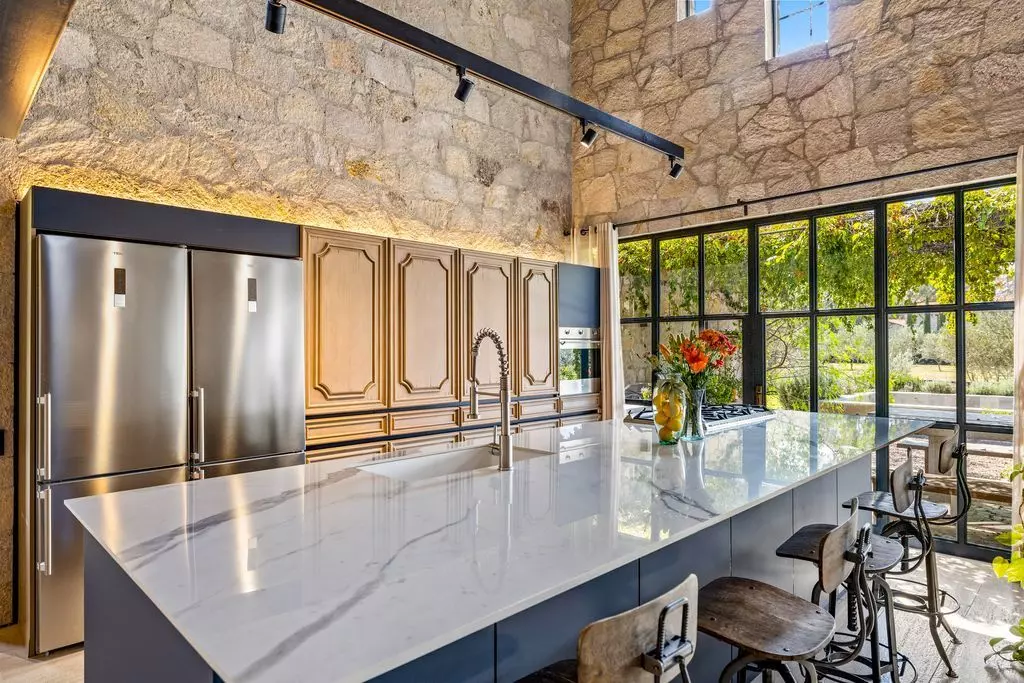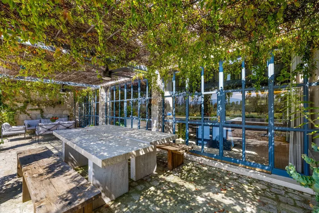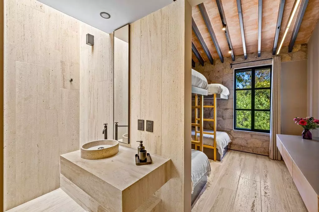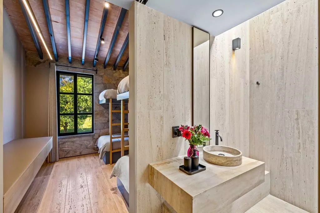 The living and dining areas are designed for both intimate gatherings and grand entertaining, enhanced by a bespoke bar and panoramic vineyard views. The gourmet kitchen blends elegance and functionality, with custom cabinetry, marble countertops, and top-tier appliances, perfect for those who love to cook and entertain in style. Outdoors, Casa Wisteria celebrates the art of al fresco living. Terraces shaded by vine-covered pergolas lead to a serene solar-heated pool, fire pit, and dining patio, the ideal setting for golden sunsets and starlit evenings. Beyond, the fragrant rows of lavender and grapevines invite long, unhurried afternoons. Each of the four en suite bedrooms offers privacy and quiet elegance. The primary suite on the ground floor opens directly onto the gardens, while the upper-level suite, featuring charming built-in bunk beds, adds a playful touch of design whimsy.