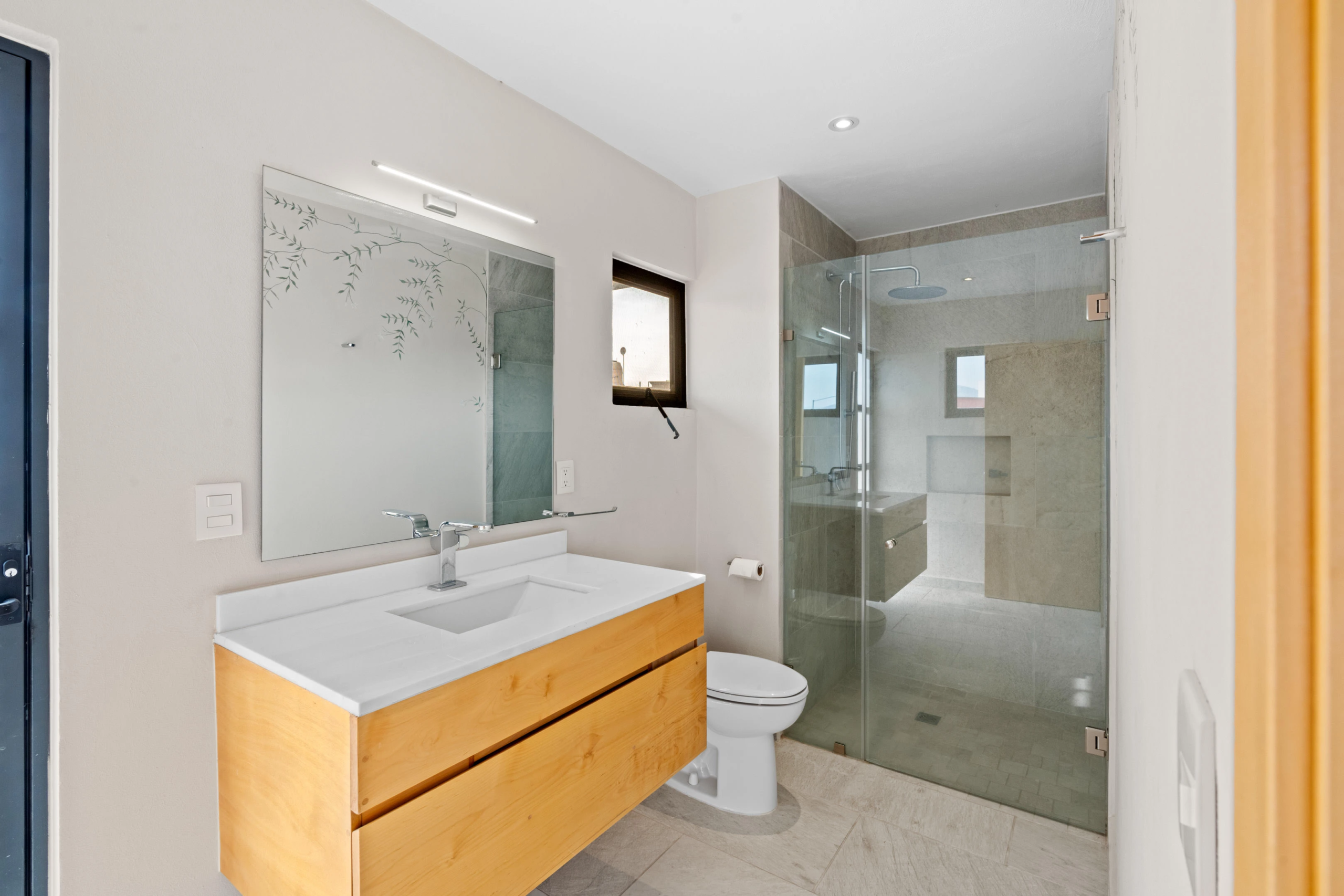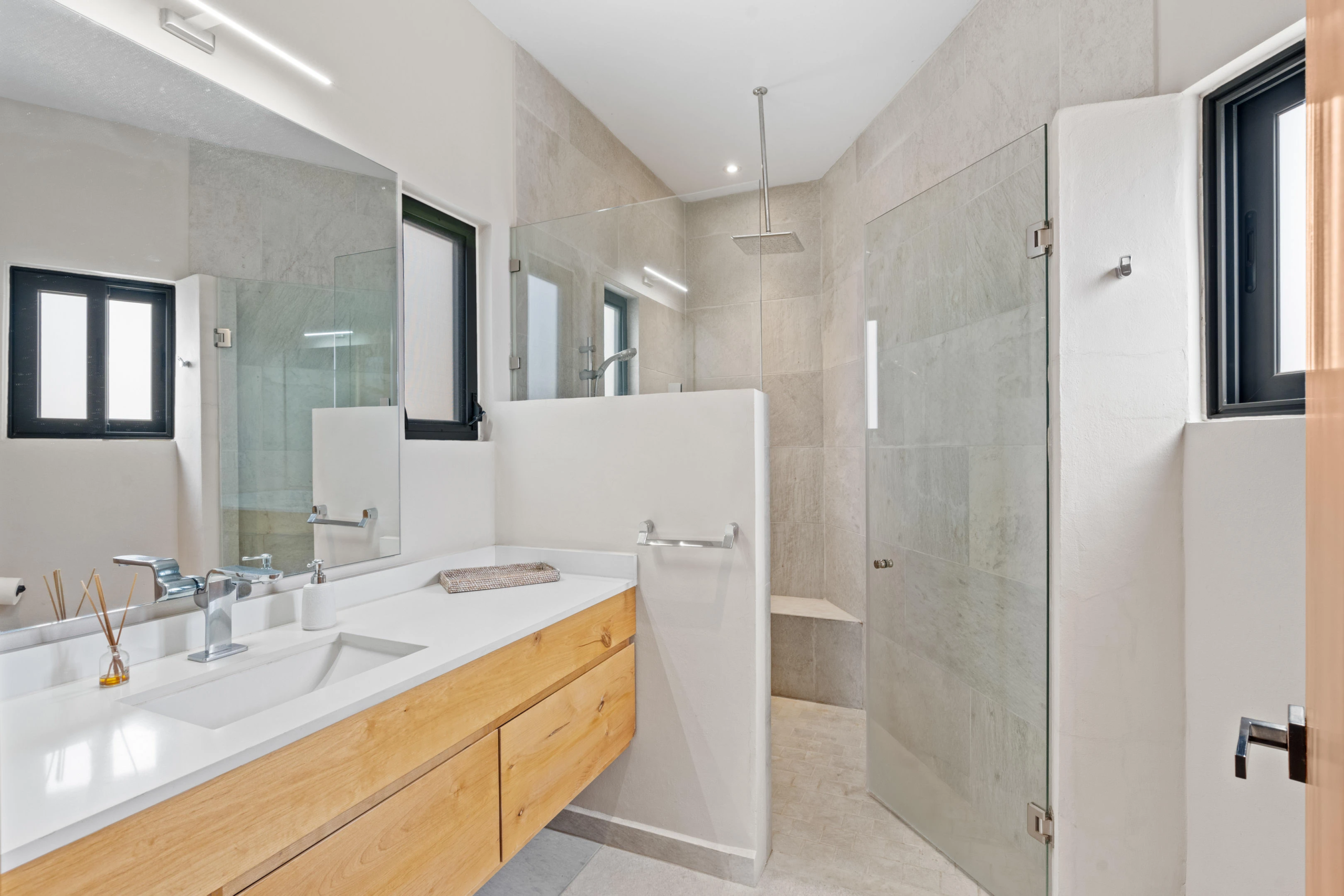 As you arrive, the home’s clean lines and minimalist facade immediately capture your attention, hinting at the sophisticated interior waiting inside. Crossing the grand entrance you’re welcomed by abundant natural light that casts a warm glow over the sleek modern furnishings throughout the space.